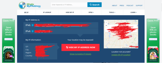 If you want to know your device’s IP address, go to this site-https://whatismyipaddress.com/. Here’s what the results were for my device’s IP address (and yes, I redacted my IP address information):