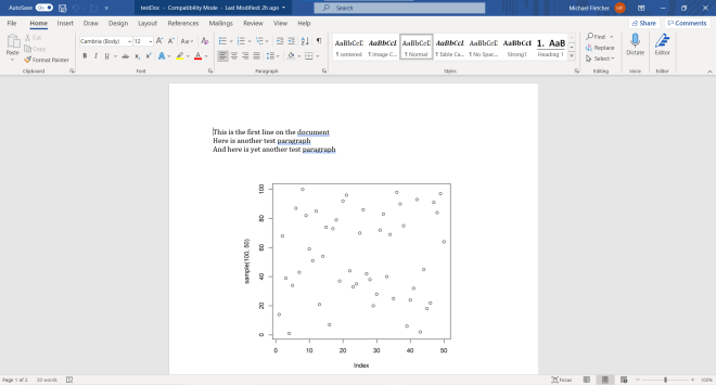 As you can see, the Word document has the three paragraphs (rather, lines) that we added, along with the plot-image that we added.