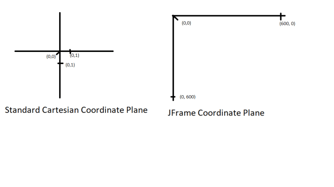 Here’s an illustration to show the difference between a standard coordinate plane and a JFrame coordinate plane: