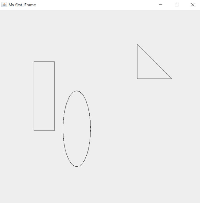 As you can see, we now have a blue rectangle, orange oval, and yellow right triangle on the JFrame. How did I accomplish this?