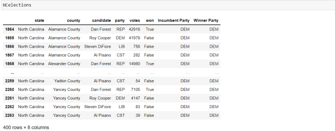 The first thing I’ll demonstrate is how to create a smaller data-frame from a larger data-frame (slicing a data-frame, in other words). Let’s say we wanted to create a smaller data-frame that focuses on the North Carolina 2020 gubernatorial election. How would we do so? Here’s how: