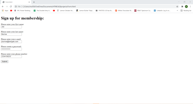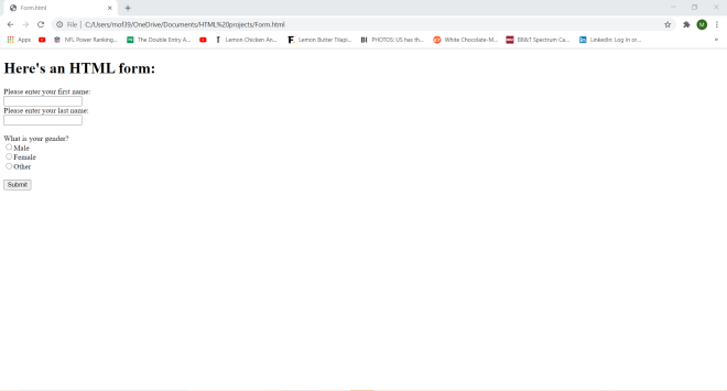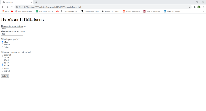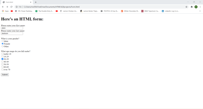 Take this HTML code (that I pulled from a form I made in HTML Lesson 7: Forms pt.2 (More Fun With Forms)) that will show you this form: